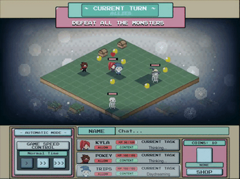 Brave the Lonely is a tactics RPG, where players aren't in direct control of their game characters, also known as "Heroes." Instead, players guide their Heroes by assigning them various tasks, or "Commands", which their heroes my refuse based on their personality and happiness. When a command is refused, the player may "Force" the Hero to complete the command against their will, at the cost of their happiness and respect for the player.